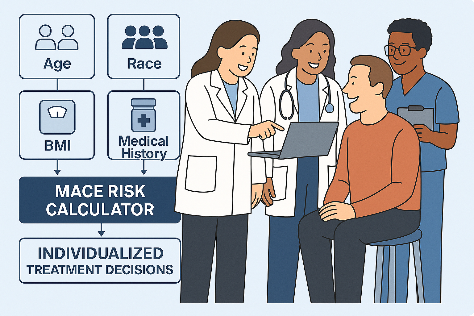 • Integration of Patient-Specific Variables: The tool allows clinicians to input individual patient data and instantly receive a personalized MACE risk score, enabling more precise decision-making.